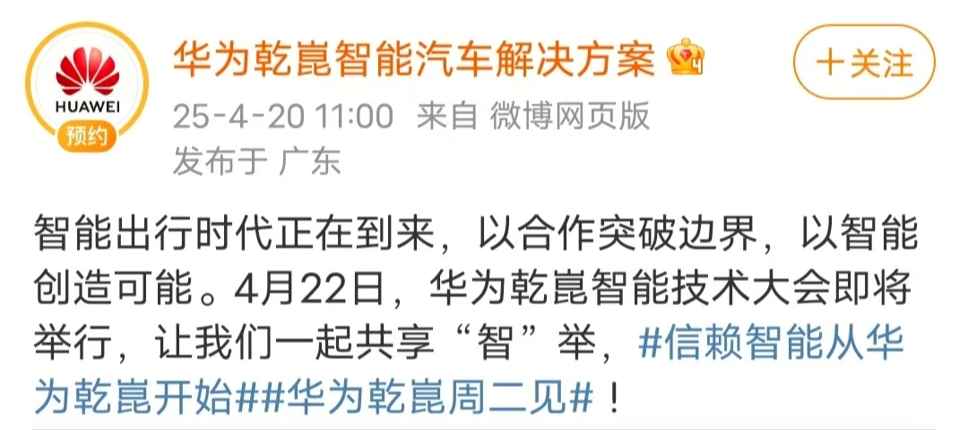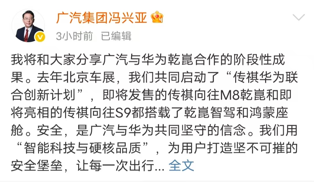 广汽集团董事长冯兴亚在微博表示,去年北京车展,广汽与华为共同启动“传祺华为联合创新计划”。他将和大家分享广汽与华为乾崑合作的阶段性成果。